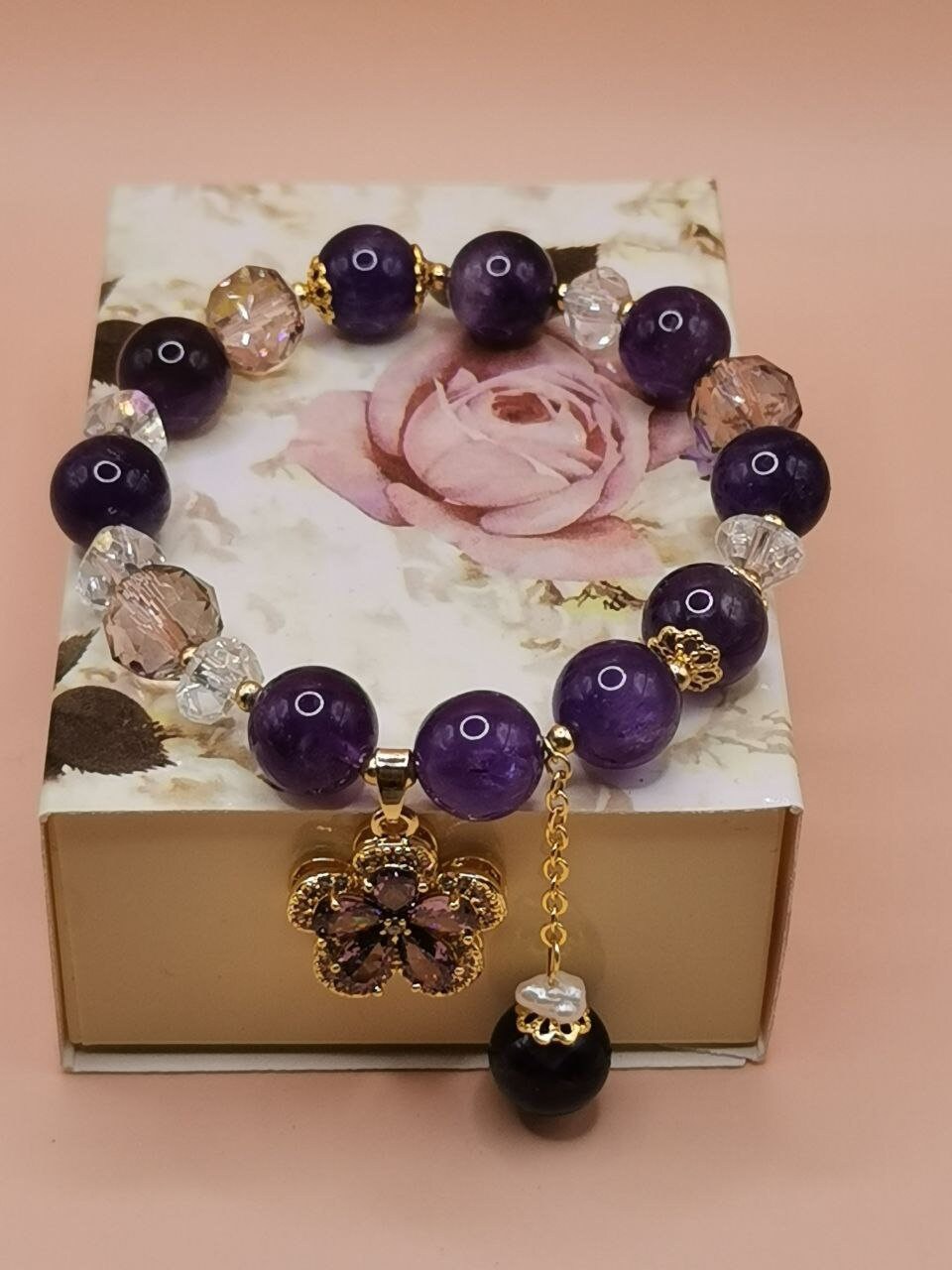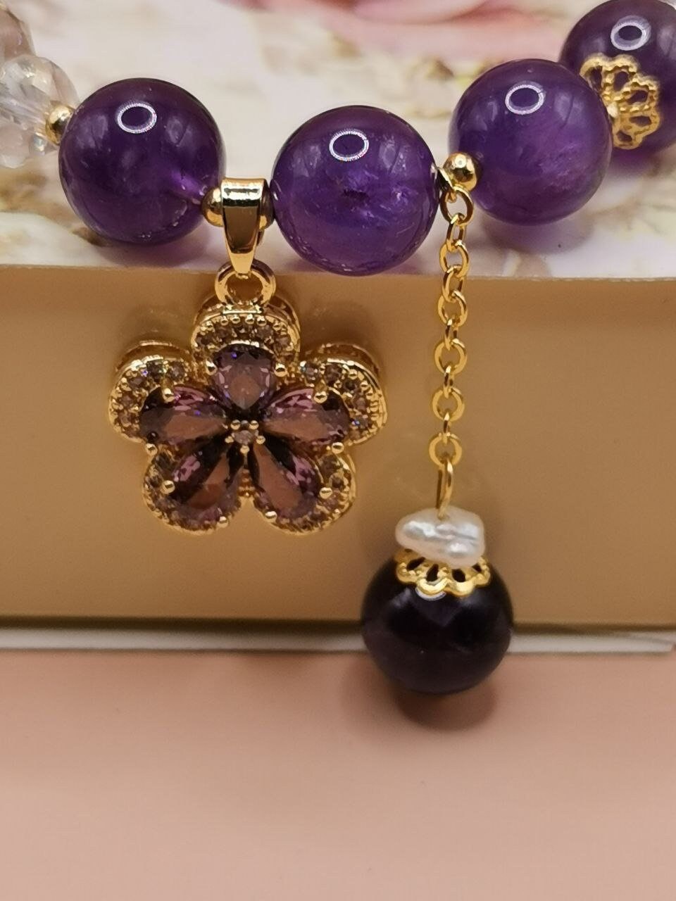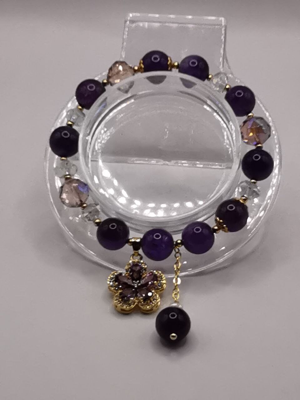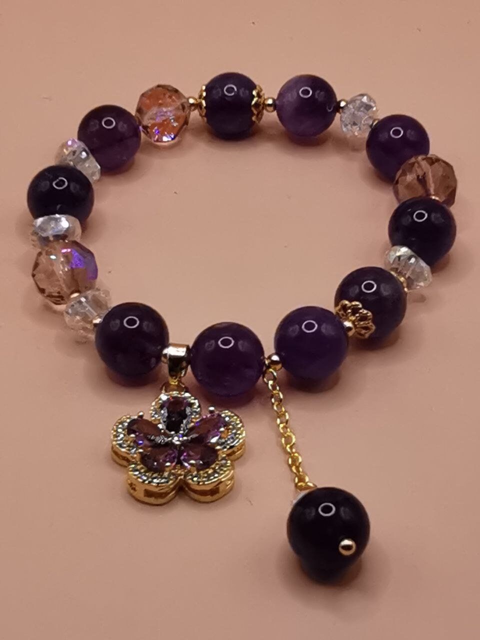 Bracelets with pendants from amethyst stones and crystal beads. A pendant from a synthetic gemstone in the form of a flower petal. Elegant ornament for hands.