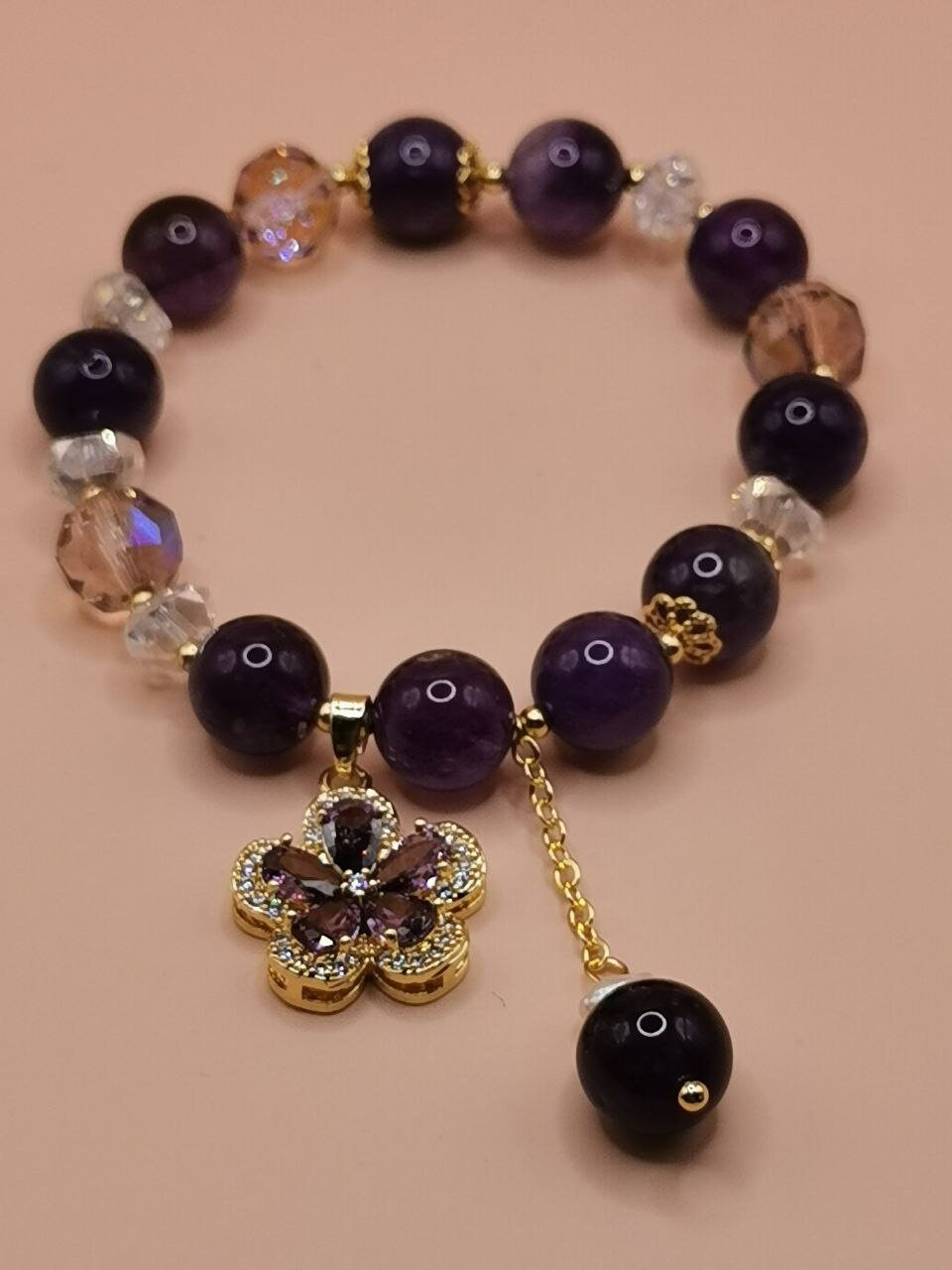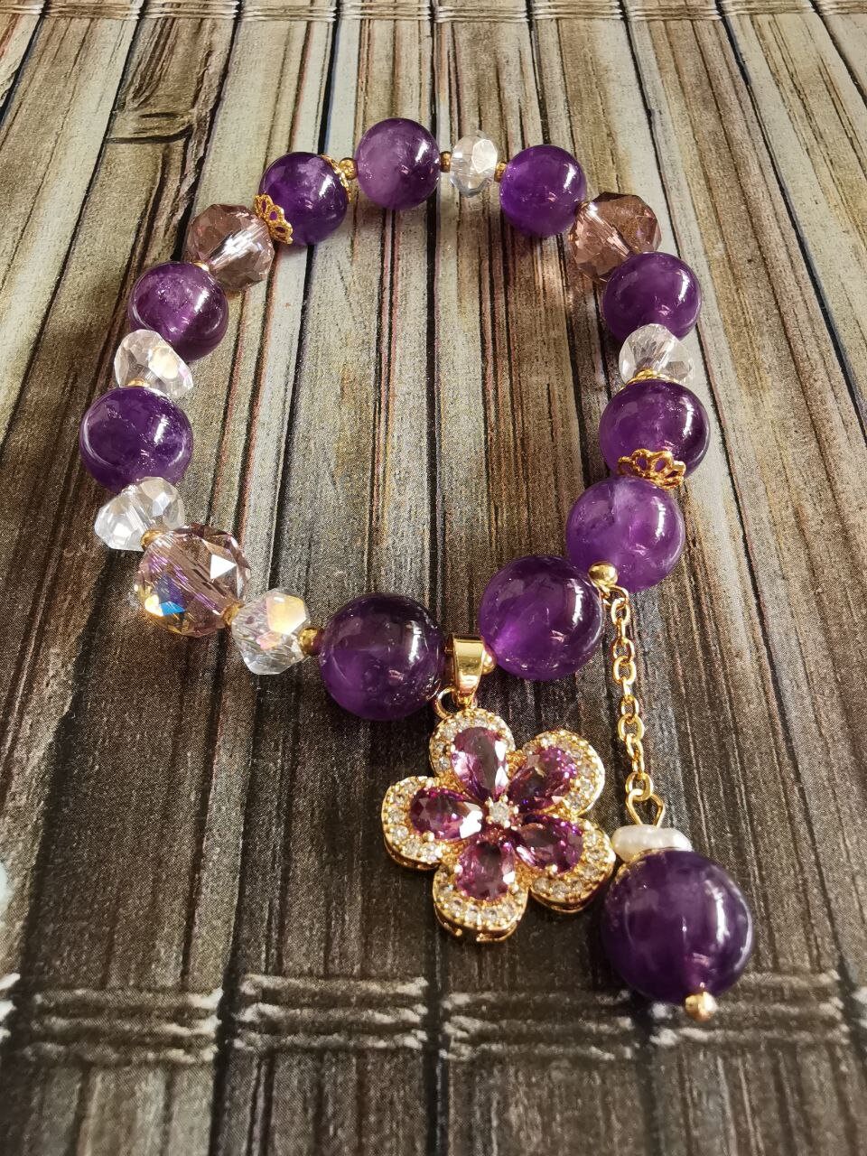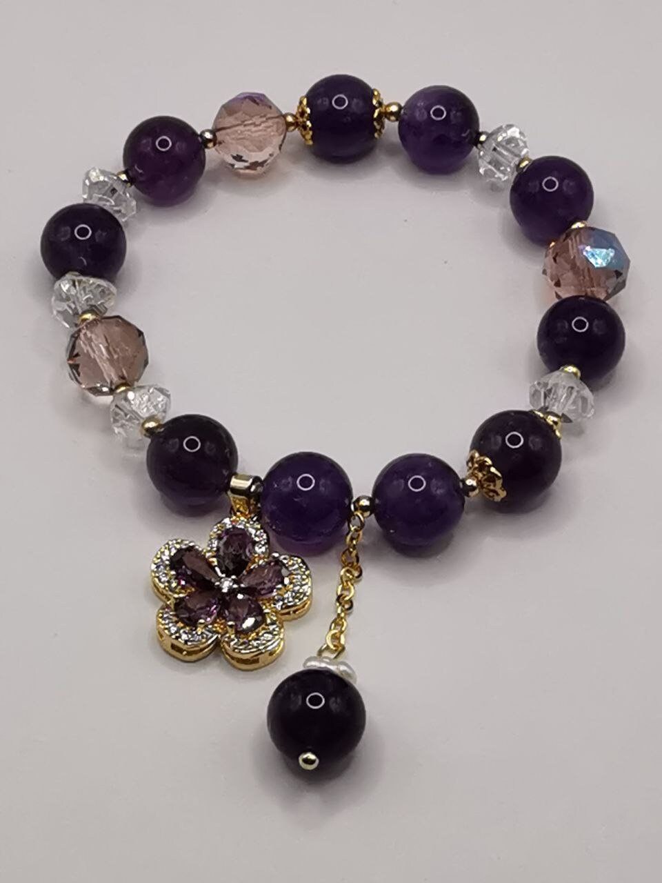Bracelets with pendants from amethyst stones and crystal beads. A pendant from a synthetic gemstone in the form of a flower petal. Elegant ornament for hands. Holiday gift, gift from amethyst.