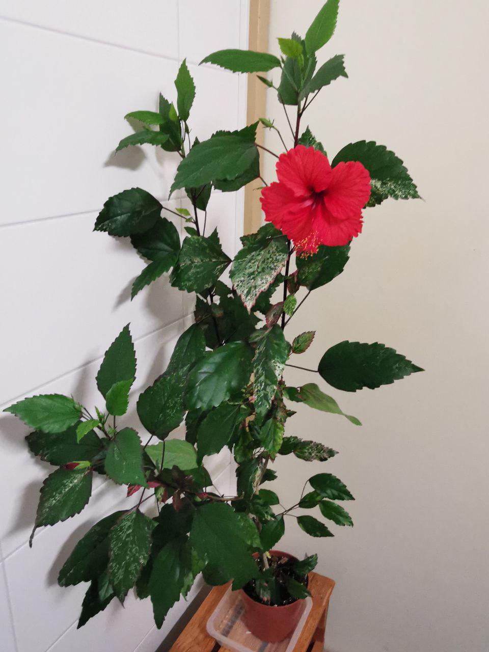 Hibiscus rosa-sinensis Cooperii. Freshly cutting. Grown for its stunning variegated foliage and brilliant single red flowers, this heritage hibiscus cultivar is making a comeback. Hibiscus Cooperii creates a fancy showpiece in the garden with its brilliantly colored leaves in shades of burgundy red, pink, white and green.