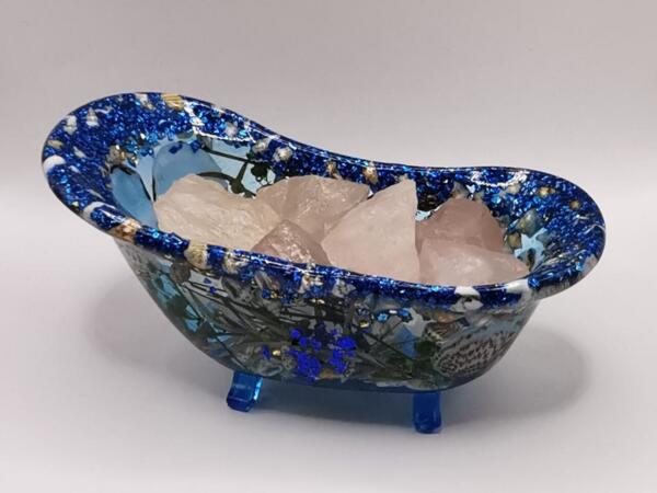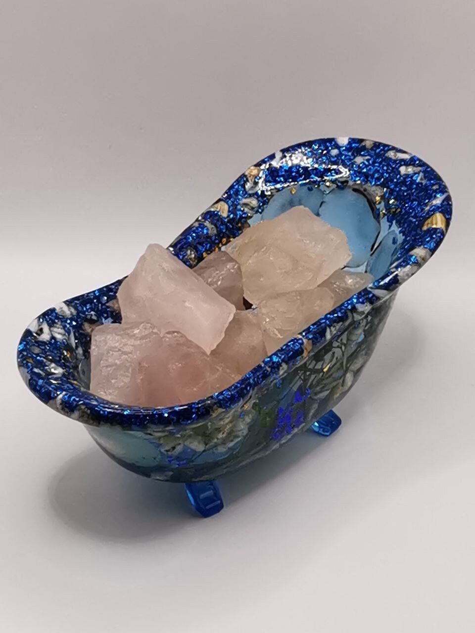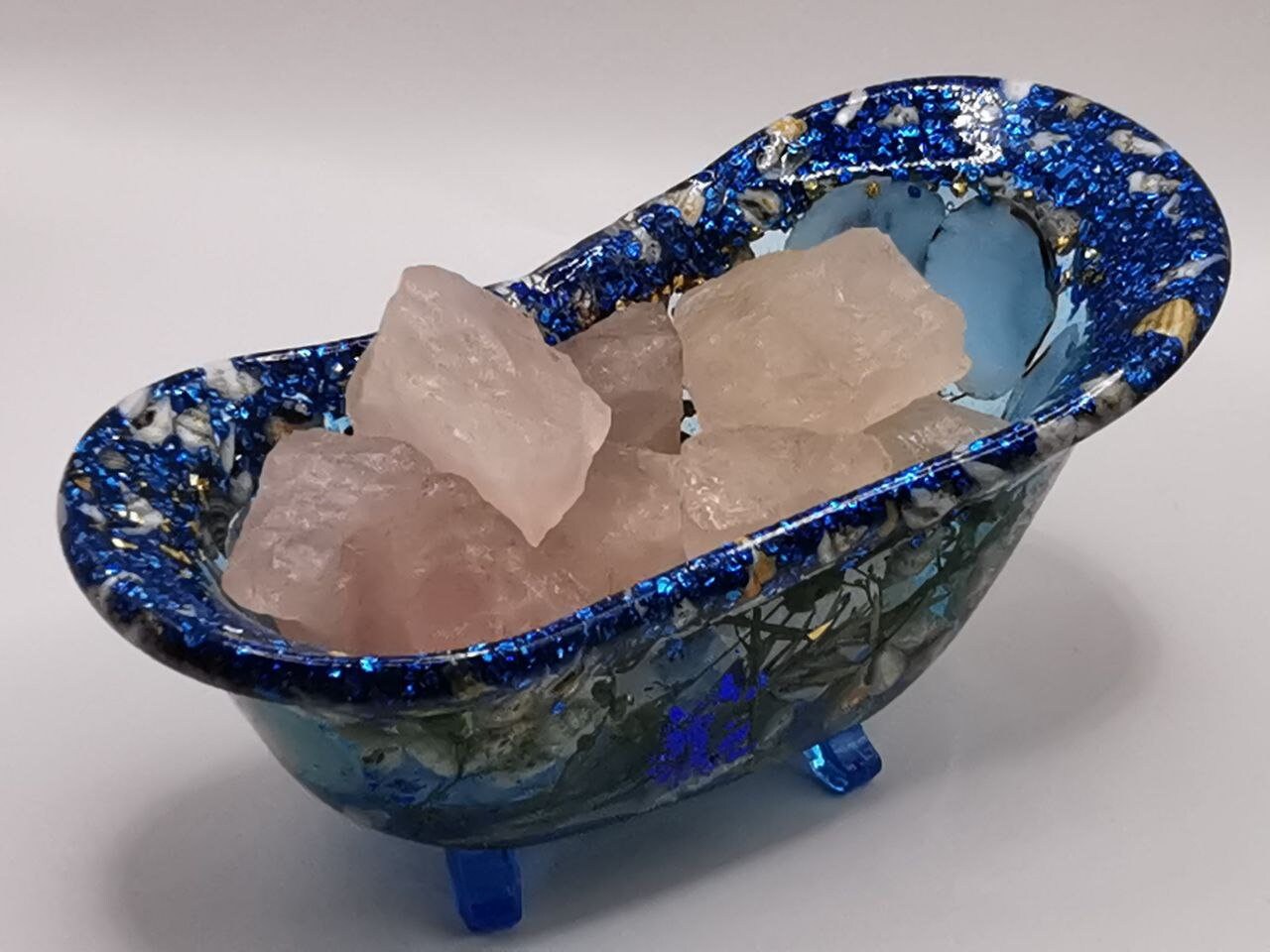 The bath contains rose quartz crystals sprinkled with natural Lavender essential oil.