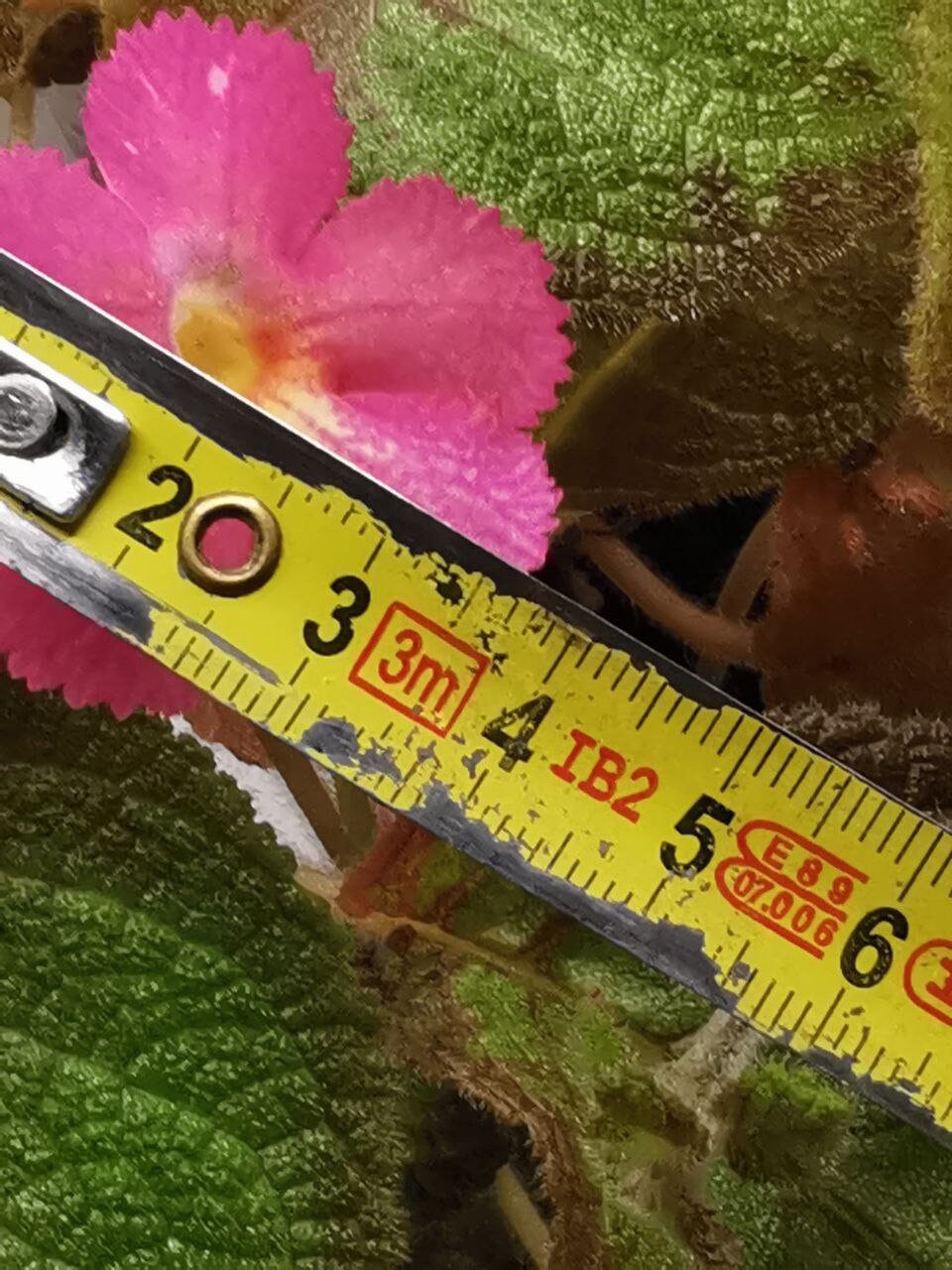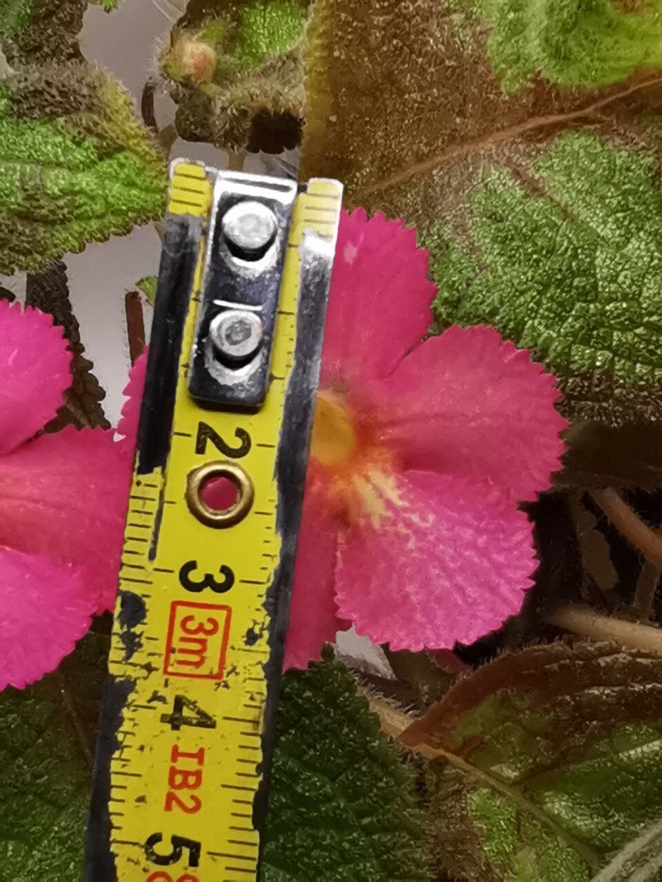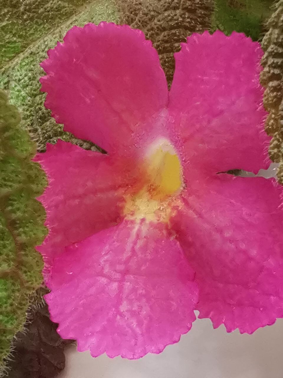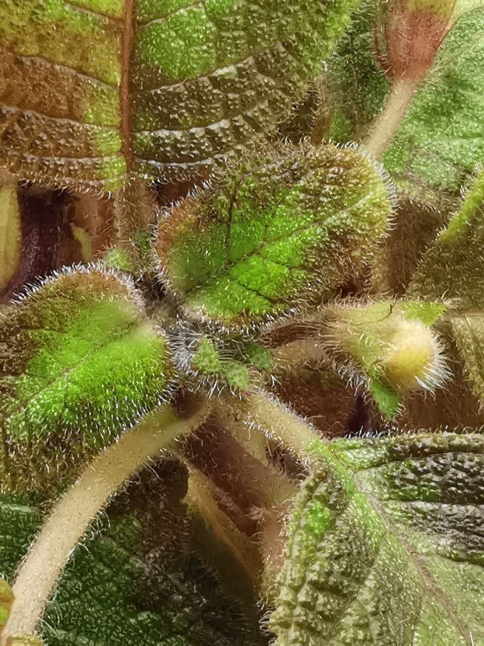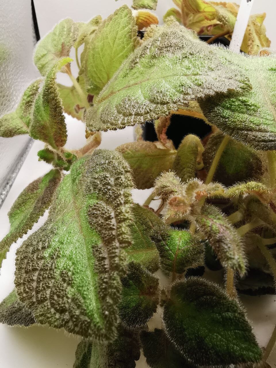 The plant has large green leaves that are velvety to the touch. A pink color appears on the leaves.